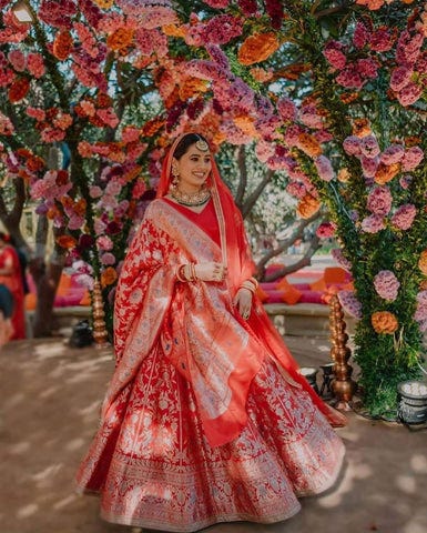 Traditional is King in wedding lehengas are still popular, as is the tradition of wearing a double dupatta. Sure, brides are experimenting with lehenga trends, but when it comes to selecting an outfit for their big day, they stick to the tried and true. When you go wedding shopping, expect to find stunning red lehengas with elaborate zardozi, gota patti, embroidery, appliqué motifs, and mirror work. An odd coloured over-the-head drape or a fashionable blouse can do the trick if you want to add some fun to the outfit.